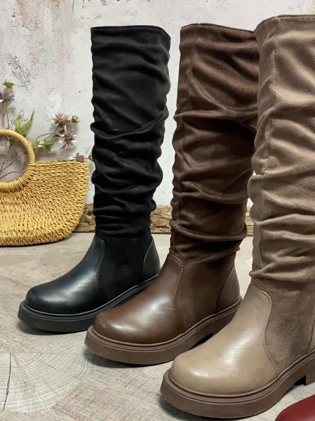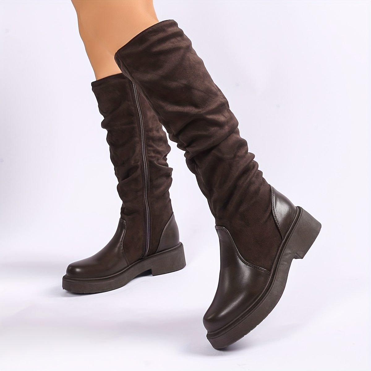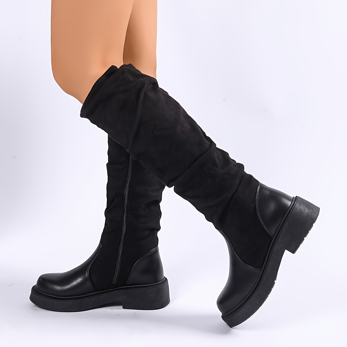 A Pair of Women’S Knee-High Boots, Casual Western Style, with Side Zipper | Fabric, Round Toe, Platform Heel, Solid Color, Suitable for All Seasons