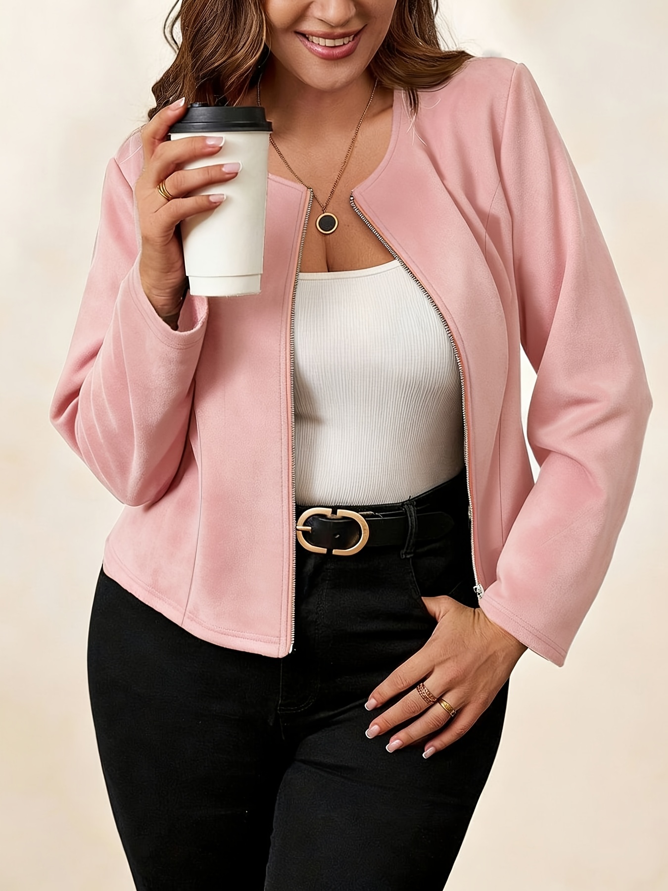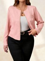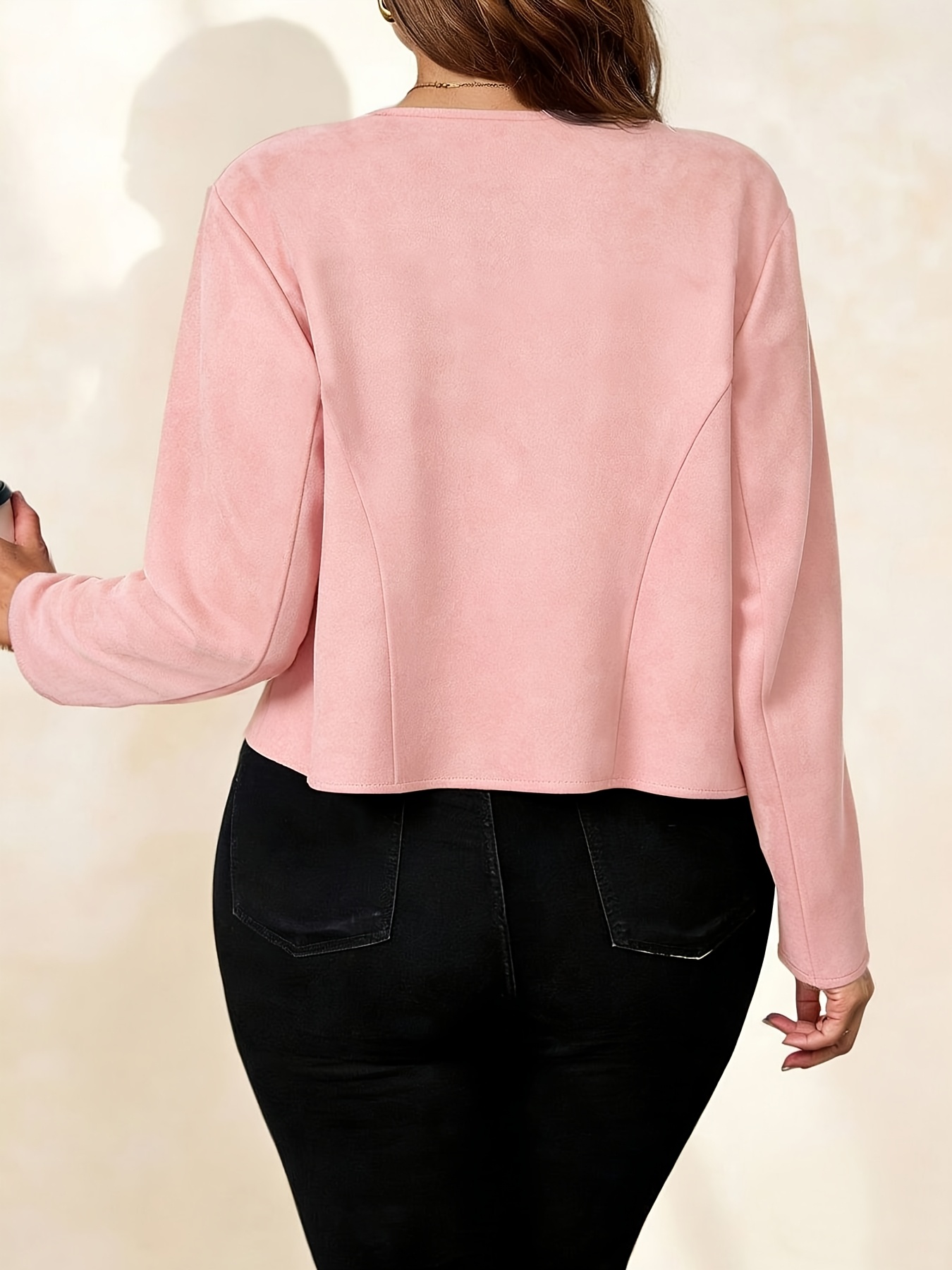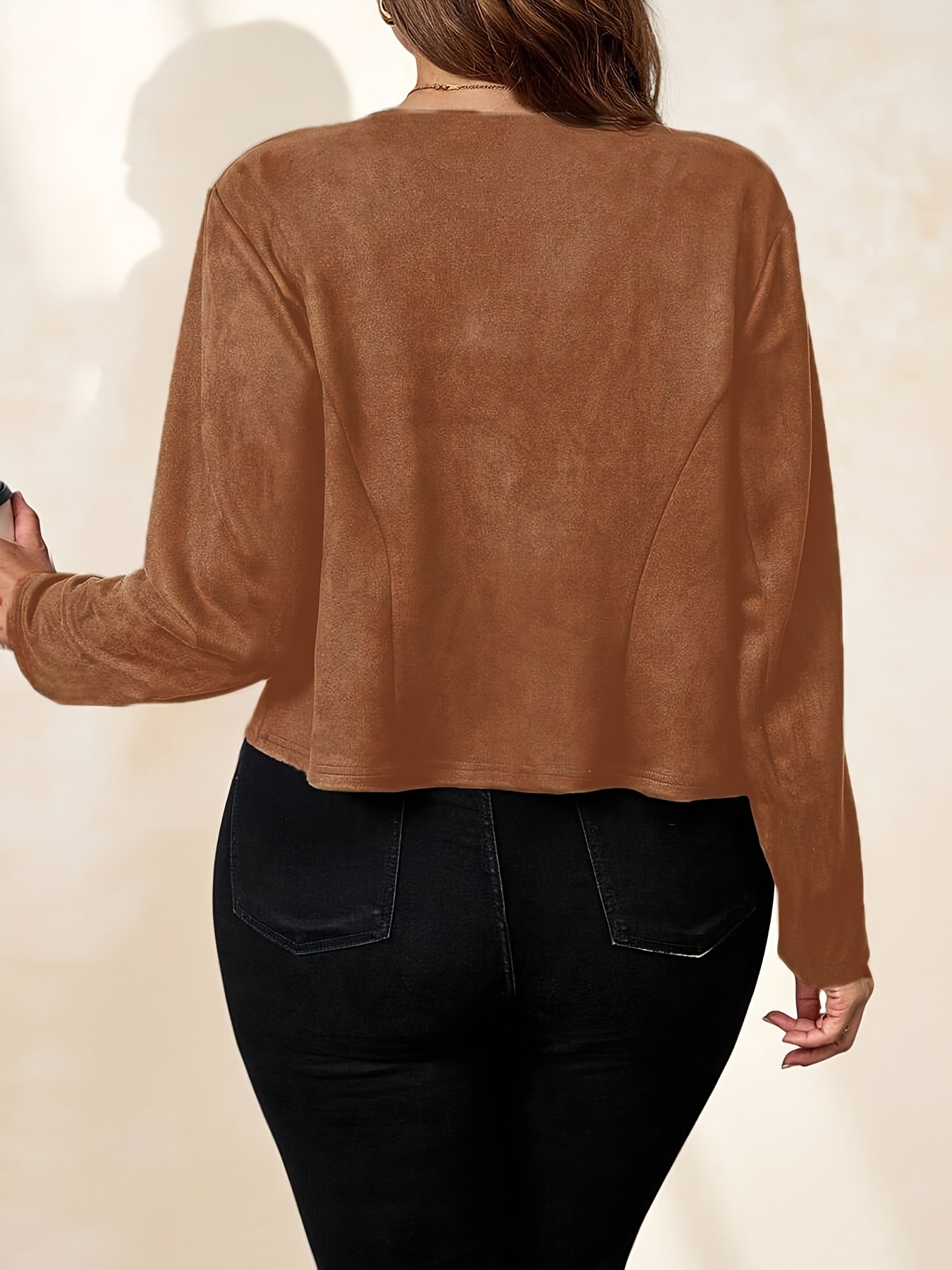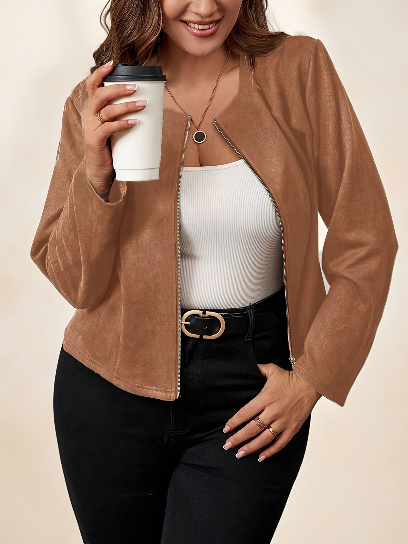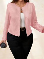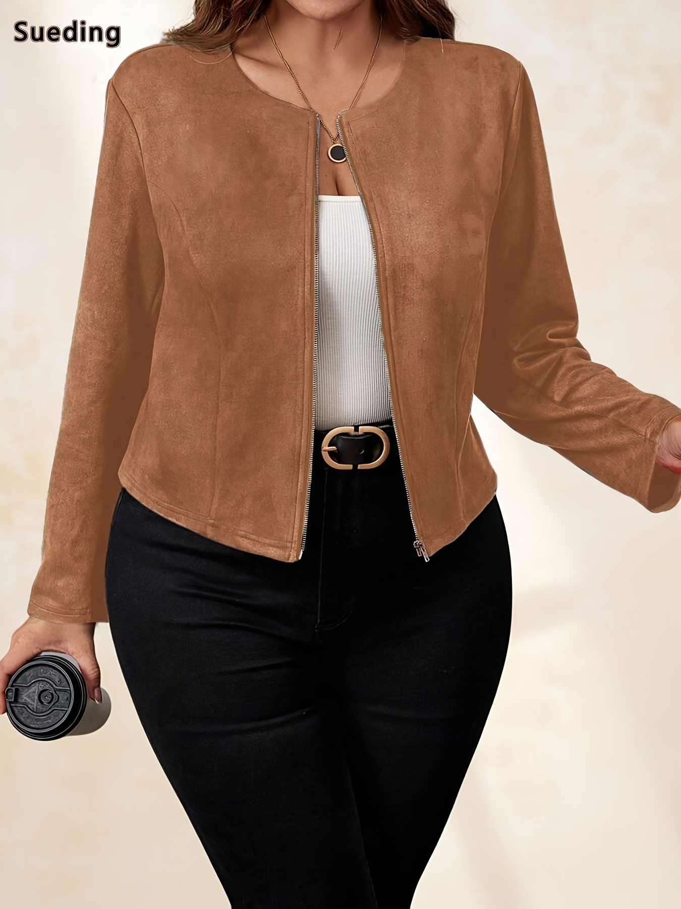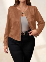 Plus Size, Autumnu002FWinter New Women’s Plus Size Solid Color Faux Suede Open Front Long Sleeve Jacket, Fashion Daily Commute Workwear Zipper Suede Cropped Casual Light Brown Women’s Clothing. Round Neck + Zipper Design Balances Neatness and Elegance