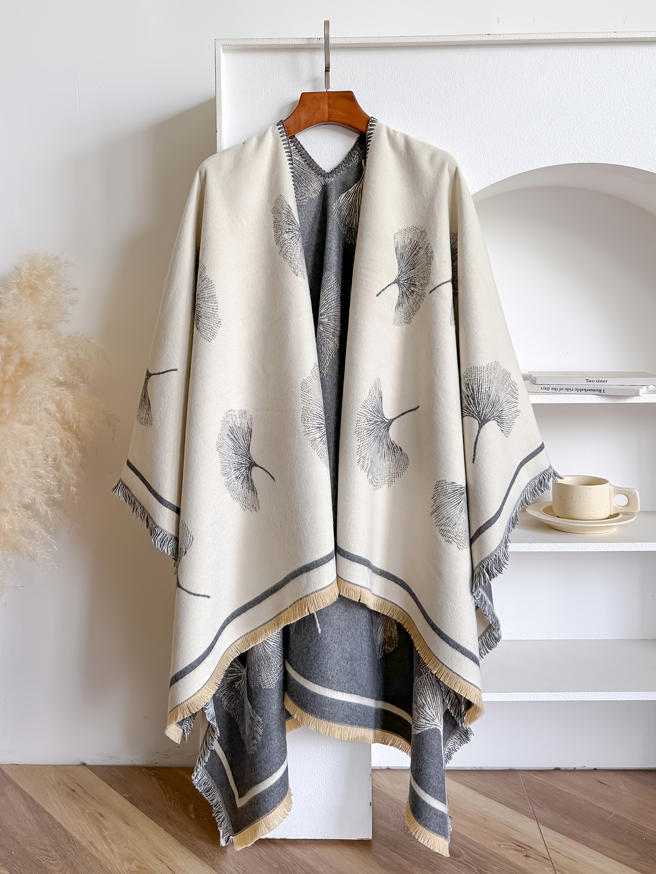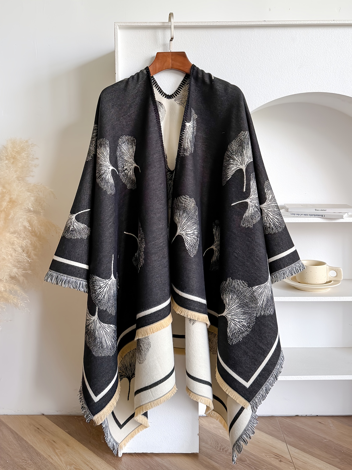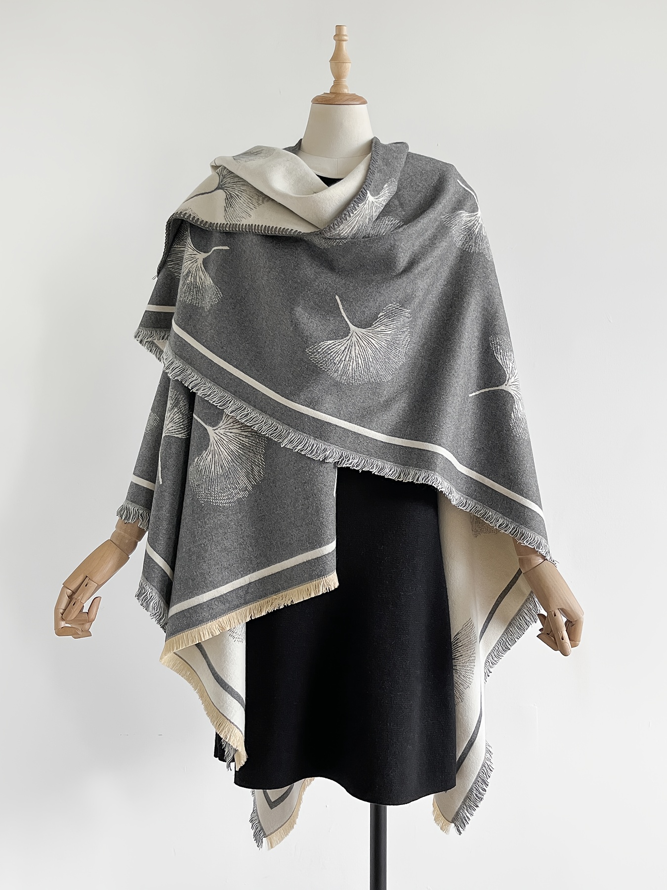 Plus Size – Plus-size Reversible Faux Cashmere Shawl Coat | Featuring Ginkgo Leaf Prints, Elegant and Gentle, Ideal Warm Cape for Vacation and Travel, Non-Stretch Fabric, Collarless, Tassel Details, Winter Season – IROJEFF