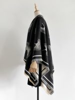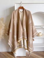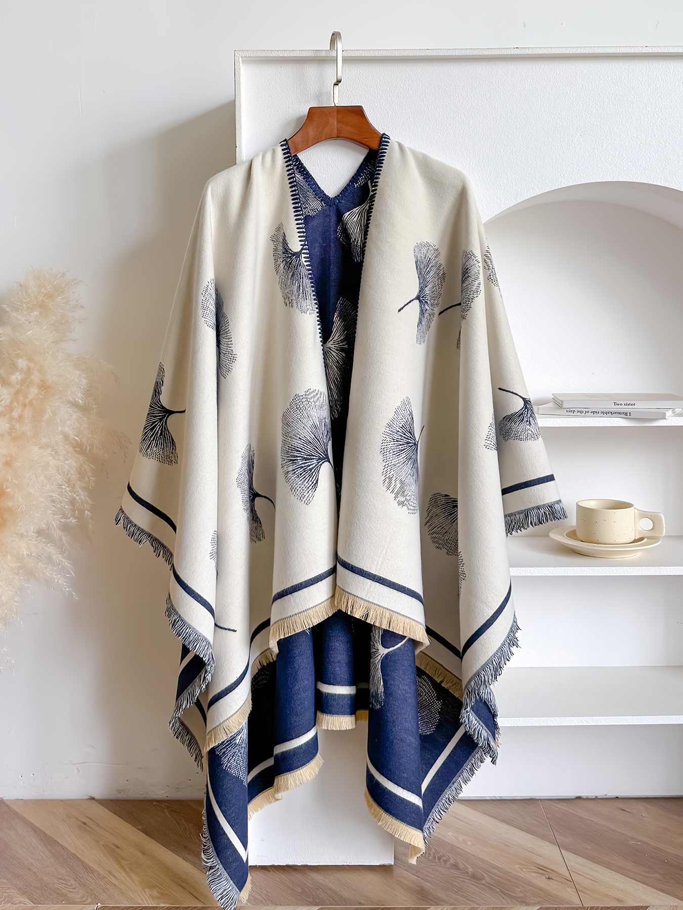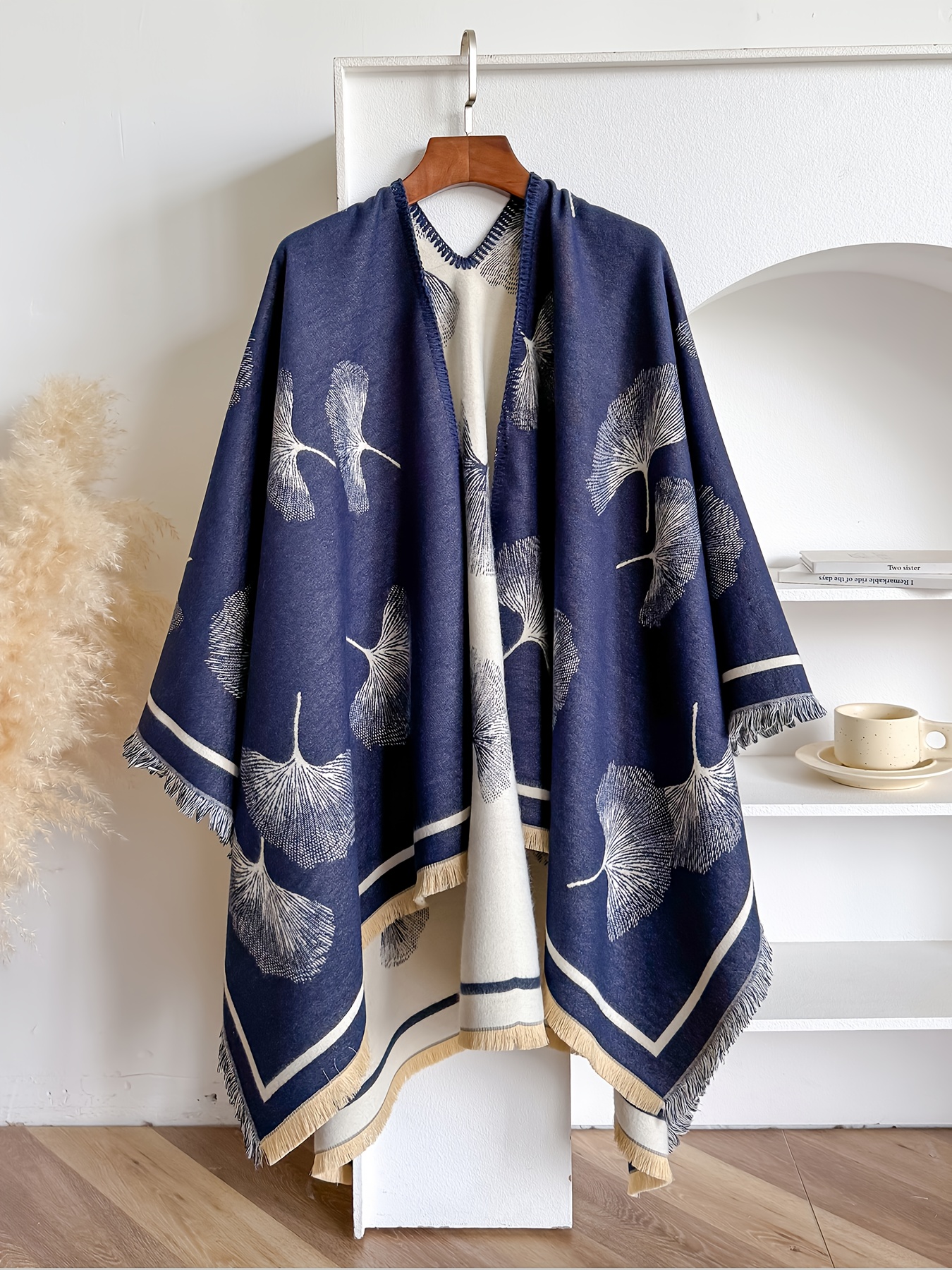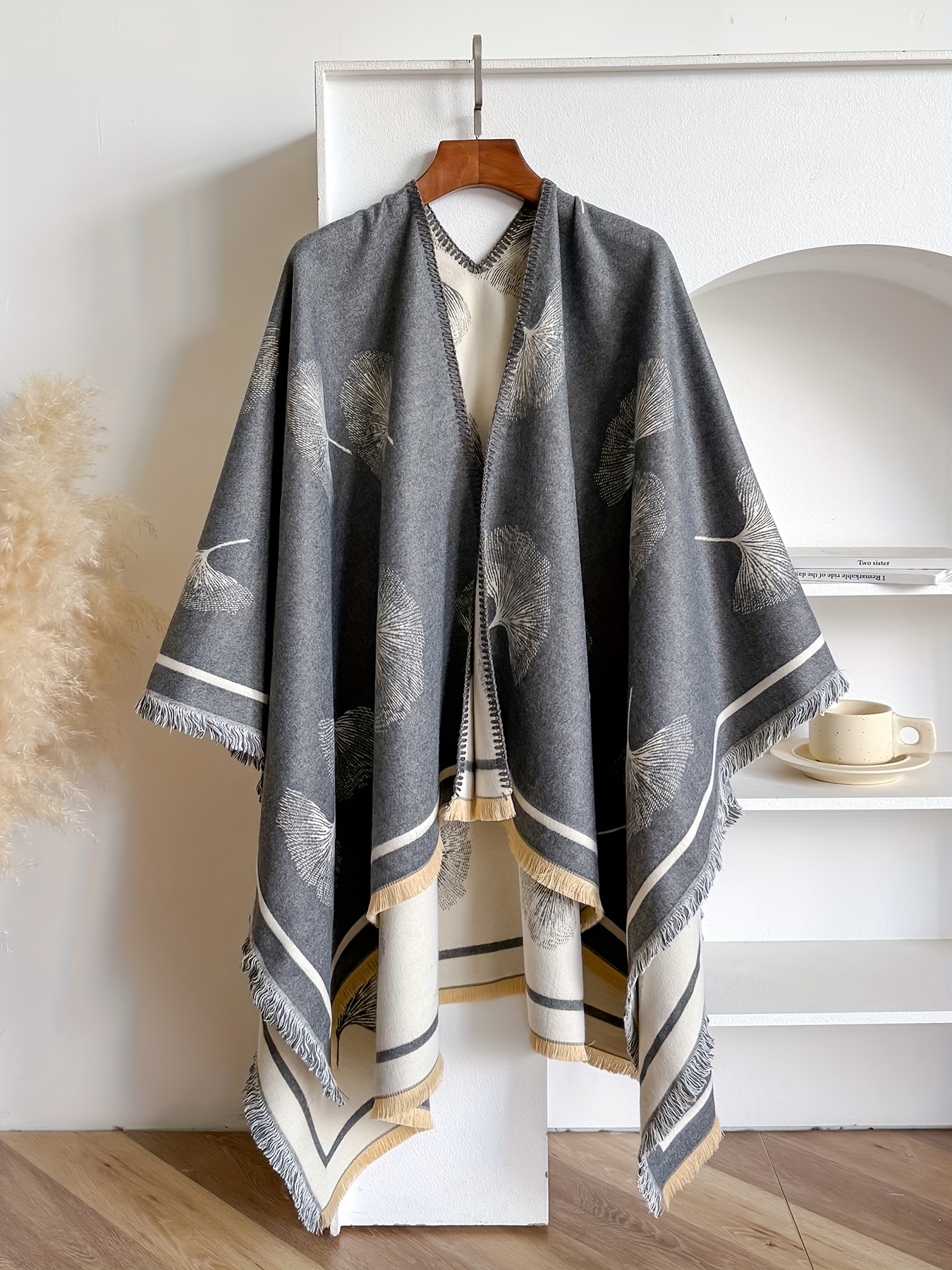 Plus Size – Plus-size Reversible Faux Cashmere Shawl Coat | Featuring Ginkgo Leaf Prints, Elegant and Gentle, Ideal Warm Cape for Vacation and Travel, Non-Stretch Fabric, Collarless, Tassel Details, Winter Season – IROJEFF