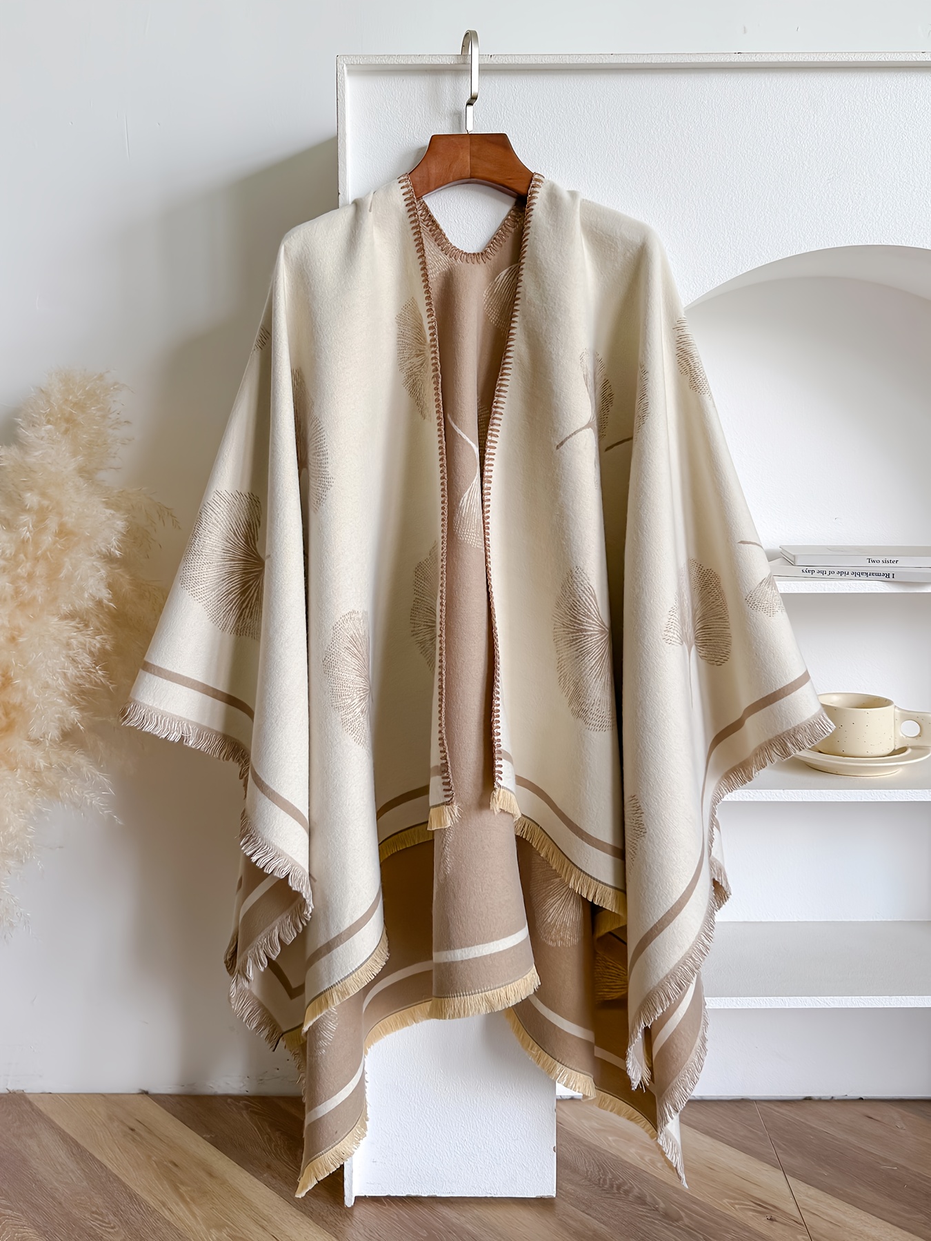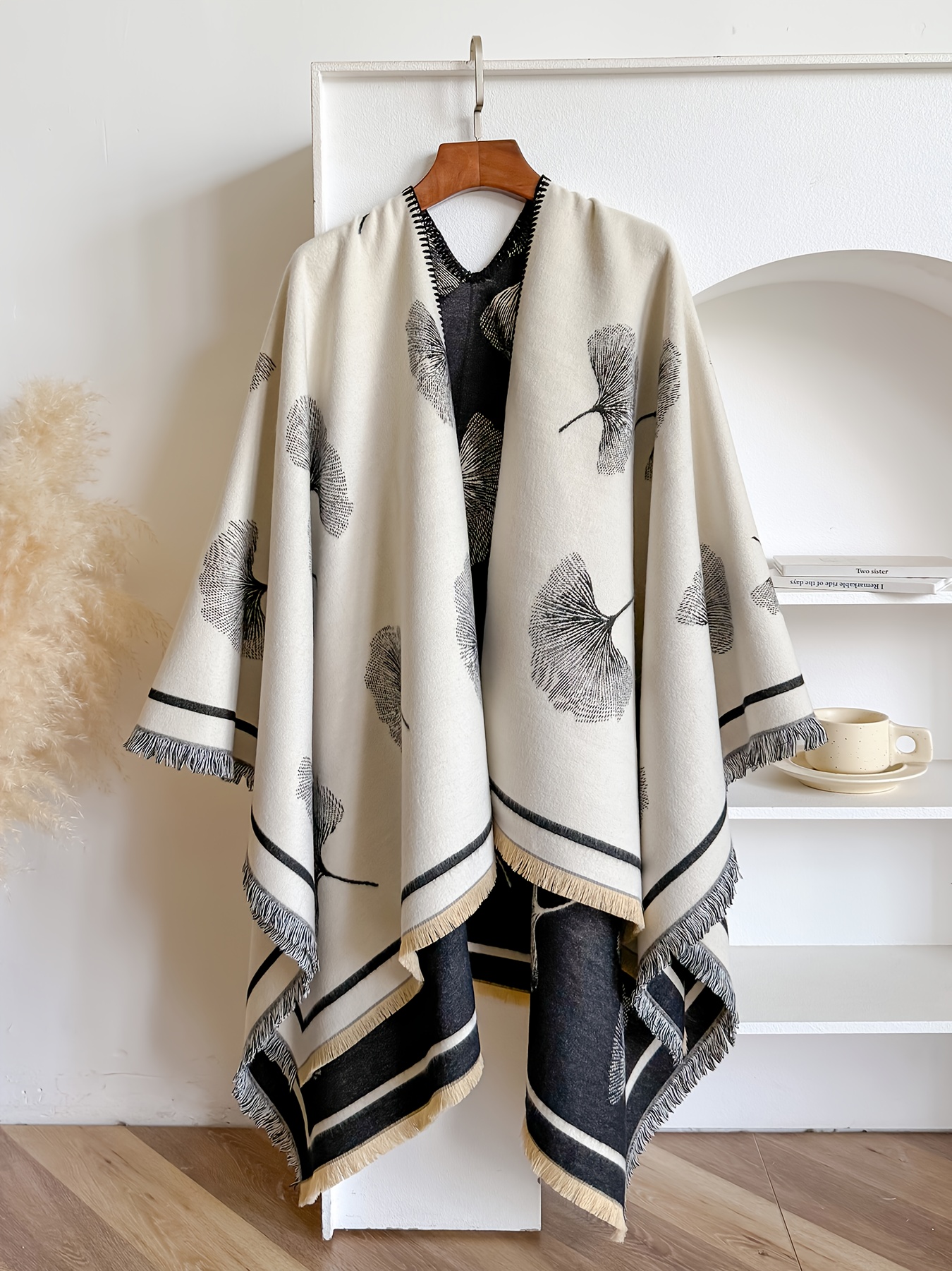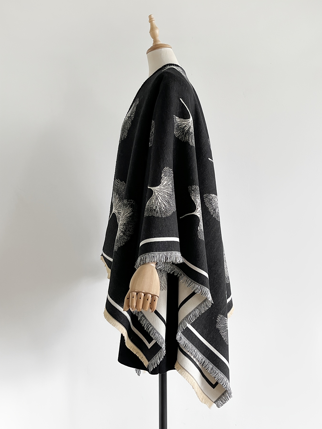 Home Curve Coats & Jackets Plus Size – Plus-size Reversible Faux Cashmere Shawl Coat | Featuring Ginkgo Leaf Prints, Elegant and Gentle, Ideal Warm Cape for Vacation and Travel, Non-Stretch Fabric, Collarless, Tassel Details, Winter Season – IROJEFF