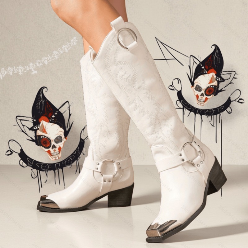 Home Women's Knee High Boots Winter New Arrival European & American Women’S Boots | Square Toe, Thick Mid Heel, Retro High Round Buckle, Fashion Embroidered Punk Style High-Top Boots, Microfiber Upper, Rubber Sole, Women Shoes