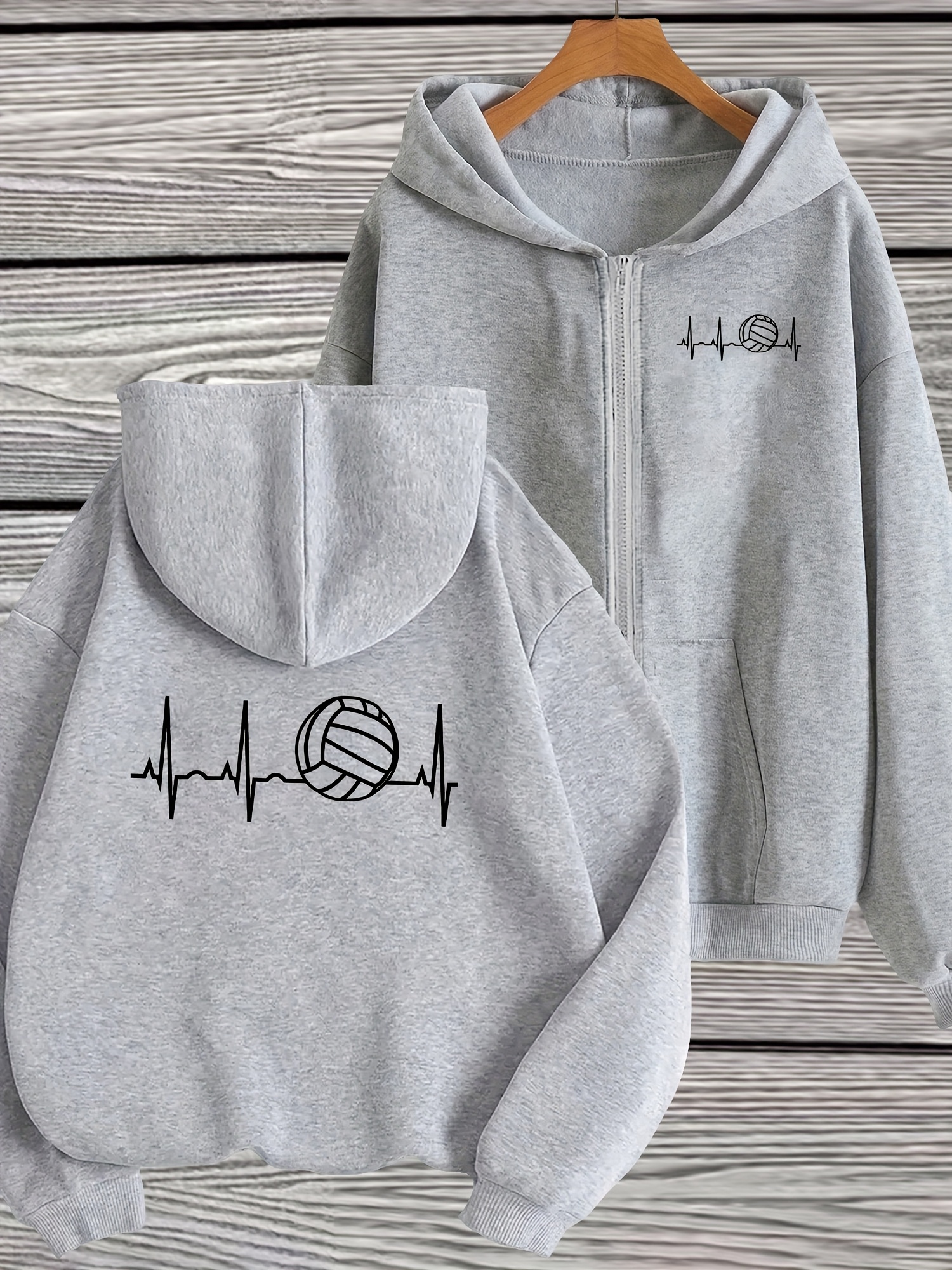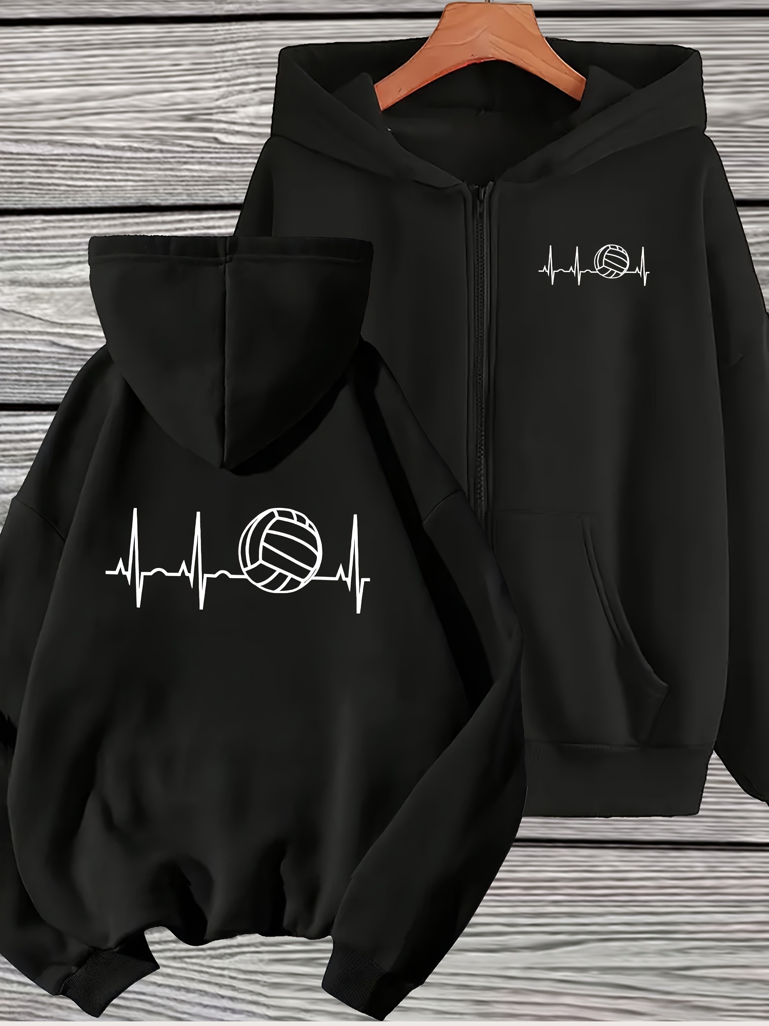 Women’s Full-Zip Hooded Jacket, Volleyball Heartbeat Line Pattern Zip-Up Hoodie, Regular Fit, Comfortable Fabric, Easy Care, All-Season, Multiple Sizes and Colors, Trendy Women’s Printed Cardigan Sweatshirt, for Sports, Fitness, and Casual Outings