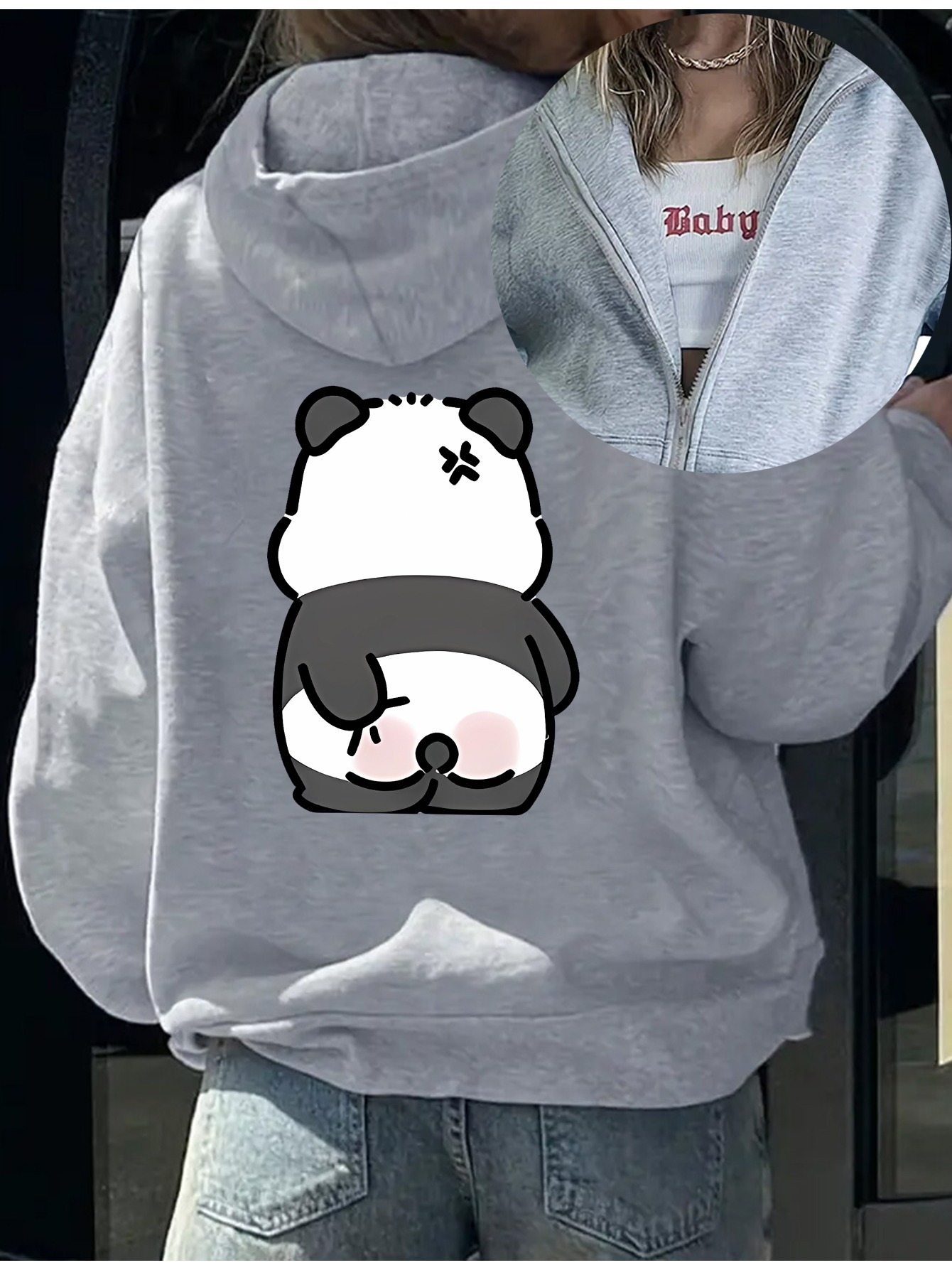 Women’S Hoodie – Cute Panda Graphic Zip-Up Hooded Sweatshirt, Light Grey with Back Print, All-Season Casual Pullover for Everyday & Panda Lovers Outfits, Panda Gifts, Comfortable Clothing, Playful Design, Durable Fabric, Streetwear Fashion, Trendy Sweatshirt, Soft Material, Zipup Top, Women